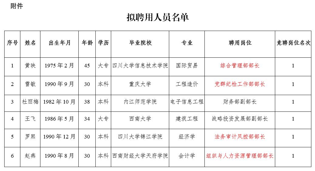 根據(jù)《瀘州阜陽投資集團有限公司關(guān)于2020年本部中層管理崗位內(nèi)部競聘的公告》(瀘阜投〔2020〕20號)規(guī)定,經(jīng)阜陽集團黨委研究決定,擬聘用黃映等6人為瀘州阜陽投資集團有限公司本部中層管理人員。現(xiàn)面向社會公示7個工作日,公示時間2020年6月2日至2020年6月10日。公示期間,如有問題,請及時向瀘州阜陽投資集團有限公司組織與人力資源管理部反映。要求舉報者署實名,實事求是地反映問題,并提供必要的調(diào)查線索。
