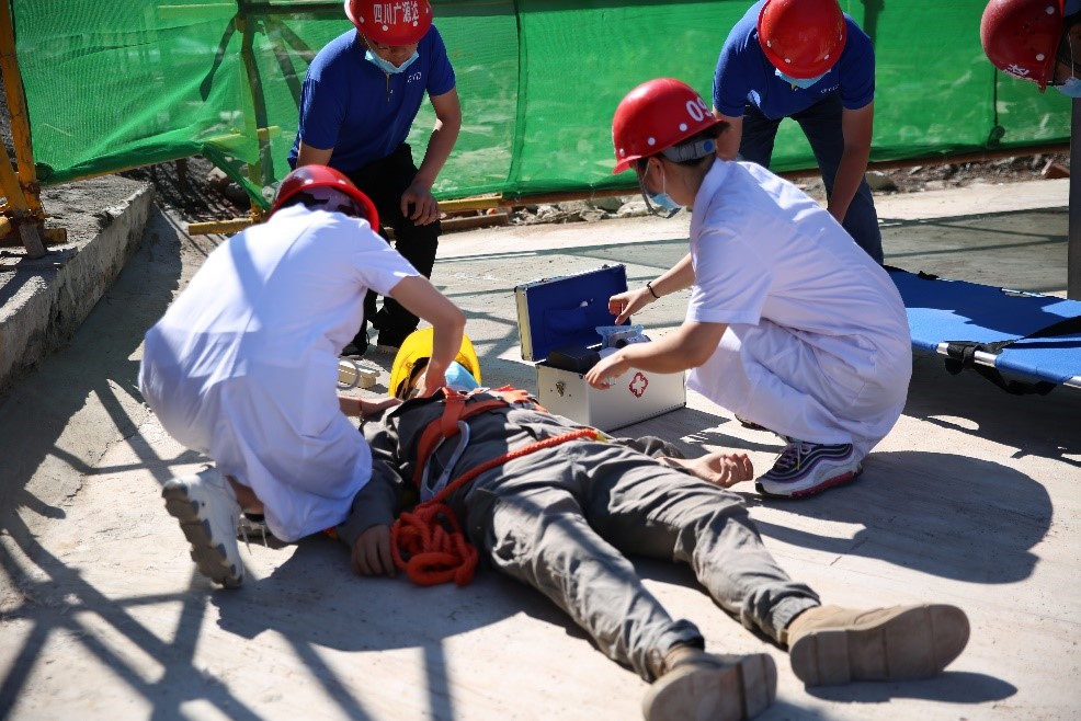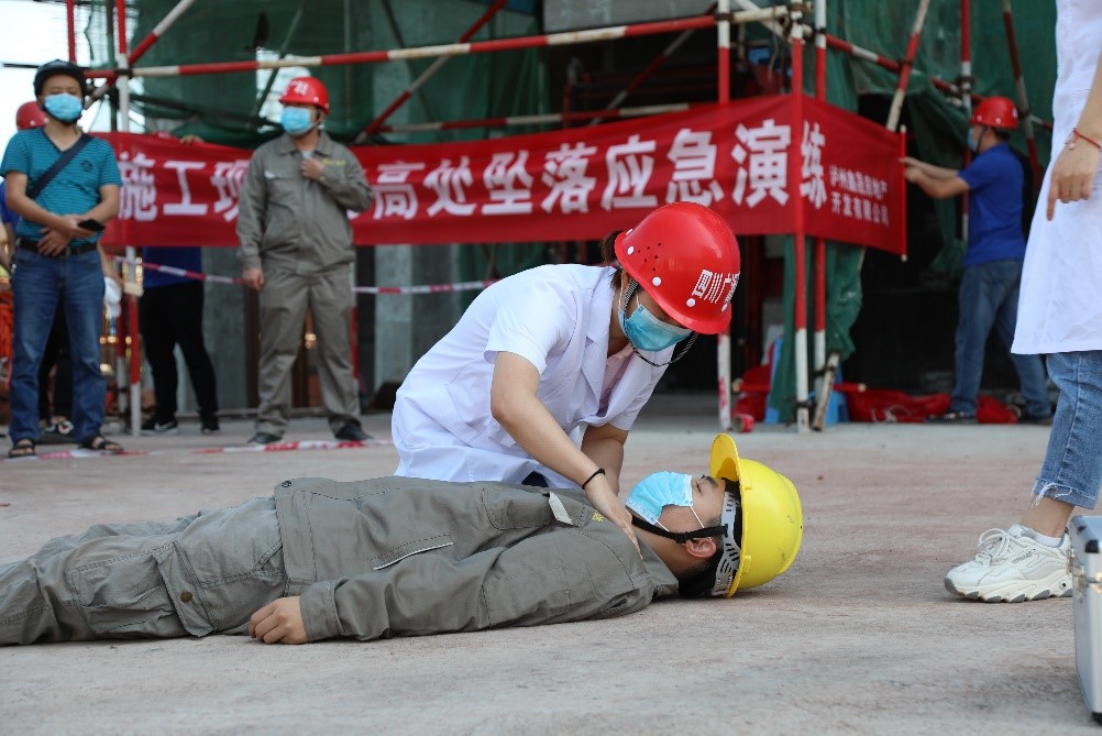 演練活動(dòng)模擬施工工人從高處墜落,項(xiàng)目部接到通報(bào)后立即啟動(dòng)應(yīng)急救援預(yù)案,“安全事故”最終得到圓滿處置。應(yīng)急救援演練后,醫(yī)護(hù)人員講解了心肺復(fù)蘇、開放性外傷包扎等應(yīng)急救援醫(yī)護(hù)方法。