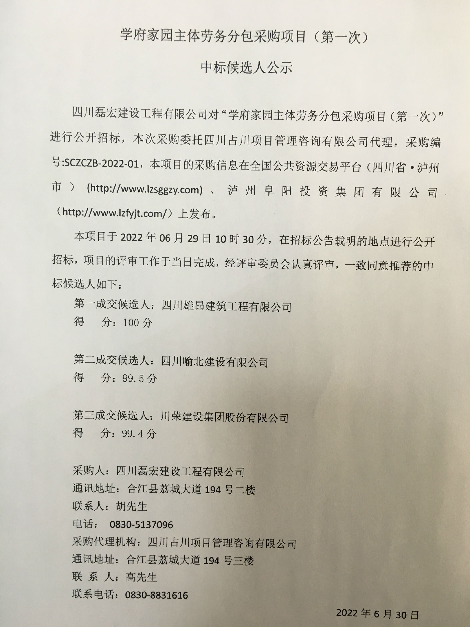 學(xué)府家園主體勞務(wù)分包采購(gòu)項(xiàng)目(第一次)中標(biāo)候選人公示