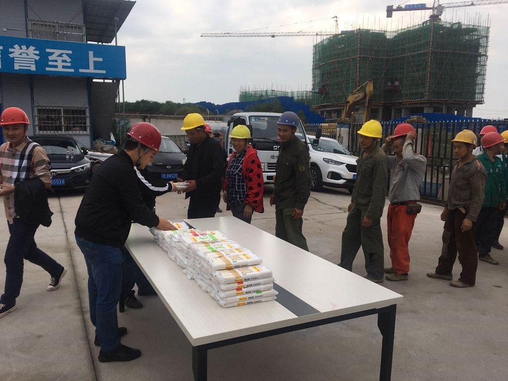 在中秋國慶雙節(jié)來臨之際,合江縣住房和城鄉(xiāng)建設(shè)局歐耀檣副局長帶領(lǐng)質(zhì)量安全監(jiān)督站人員到鑫晟學(xué)府項目為一線工人發(fā)放國慶面。歐耀檣副局長向常年奮戰(zhàn)在一線的建筑工人致以節(jié)日的問候,希望一線工人在工作中要時刻增強安全意識,既要把工作干好,更要注意自身安全,度過平安、快樂、祥和的中秋節(jié)、國慶節(jié)。